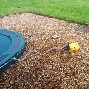 Tarvitset vain yksinkertaisen pintavesipumpun veden poistoon tarpeen mukaan, esimerkiksi jos kuoppa täyttyy vedellä rankkasateen jälkeen. Kytke pumppuun tilapäinen sähkönsyöttö (käytä jatkojohtoa lähimmästä pistorasiasta), liitä se pumppuun, aseta tulovesiletku trampoliinin kuoppaan ja johda poistovesiletku muualle ja käynnistä pumppu.