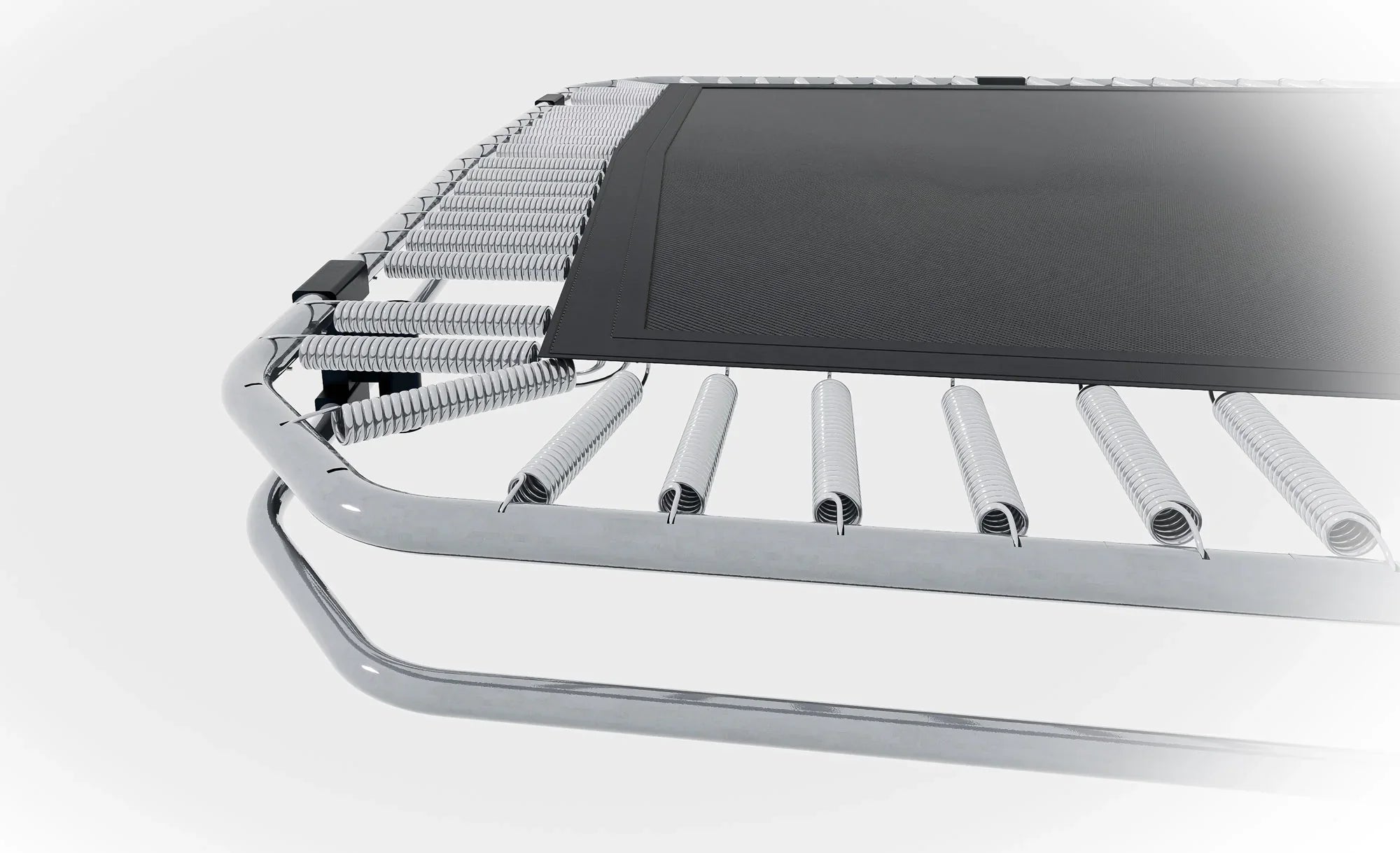 Ainutlaatuiset jousijatkeet säätävät jousen kireyttä parhaimman kimmoisuuden aikaansaamiseksi - Reunasuojan ja trampoliinin välissä oleva verkko varmistaa, että jouset ovat suojattuna ja että puhelimia tai leluja ei päädy trampoliinin alla olevaan kuoppaan